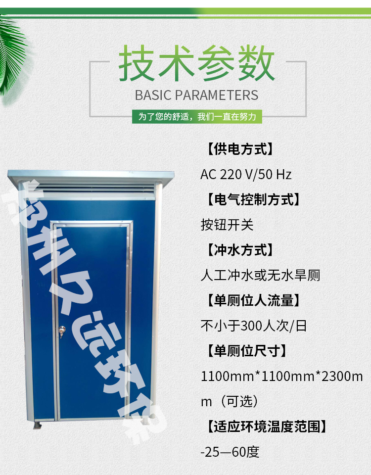 移動廁所不受任何工作環(huán)境的限制,外形結(jié)構(gòu)輕巧,顏色搭配合理。 適用于城市街道、旅游景點、建筑工地、公園綠化、生活小區(qū)、車站、碼頭、廣場等人口密集的公共場所及繁華商業(yè)街等場所。 移動洗手間具有可移動性、方便運輸、安裝簡單等優(yōu)點。 移動廁所水沖式內(nèi)部配置: 蹲便器、沖水箱、洗手池、排風扇、照明開關(guān)、門鎖 ...